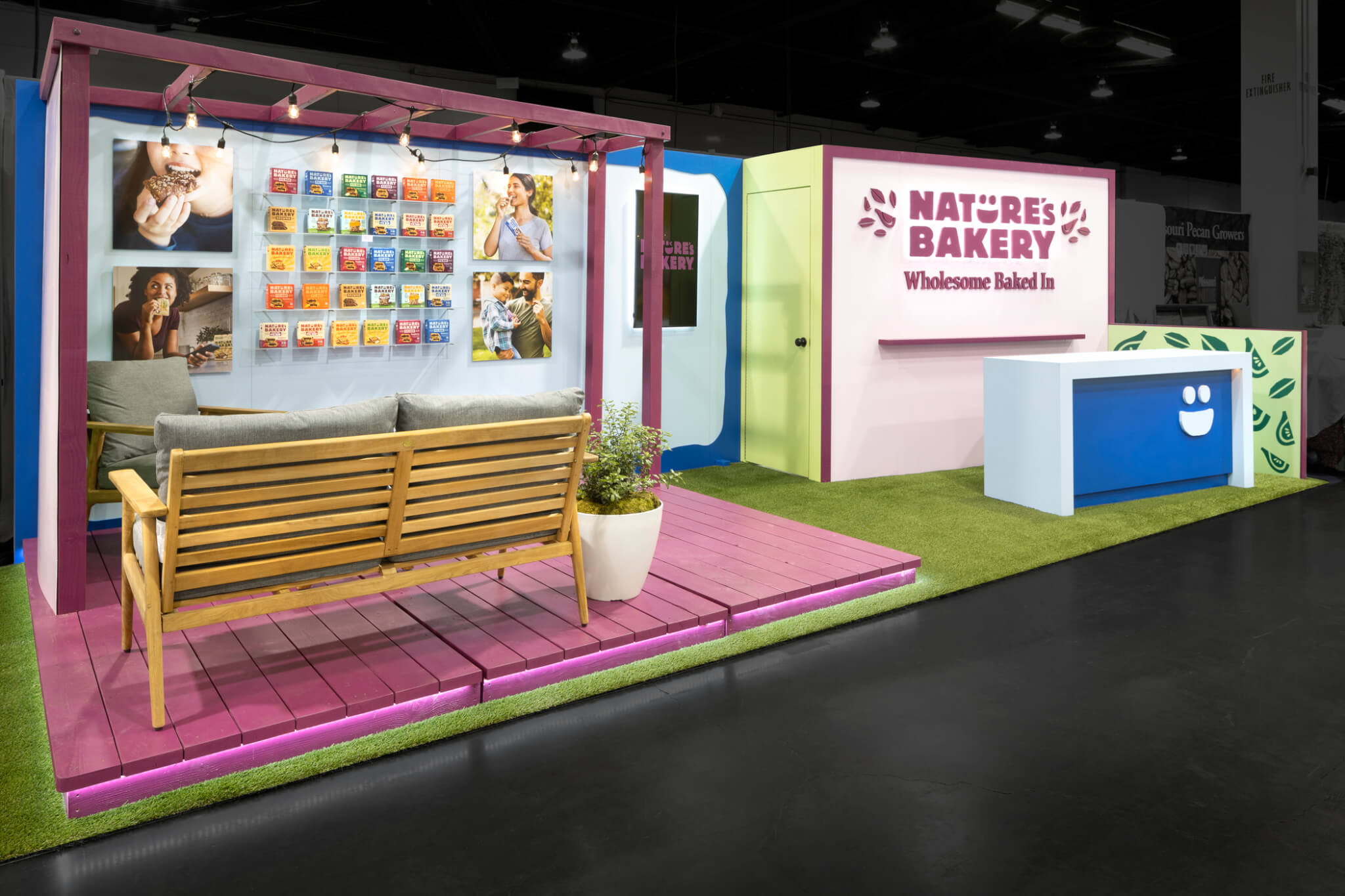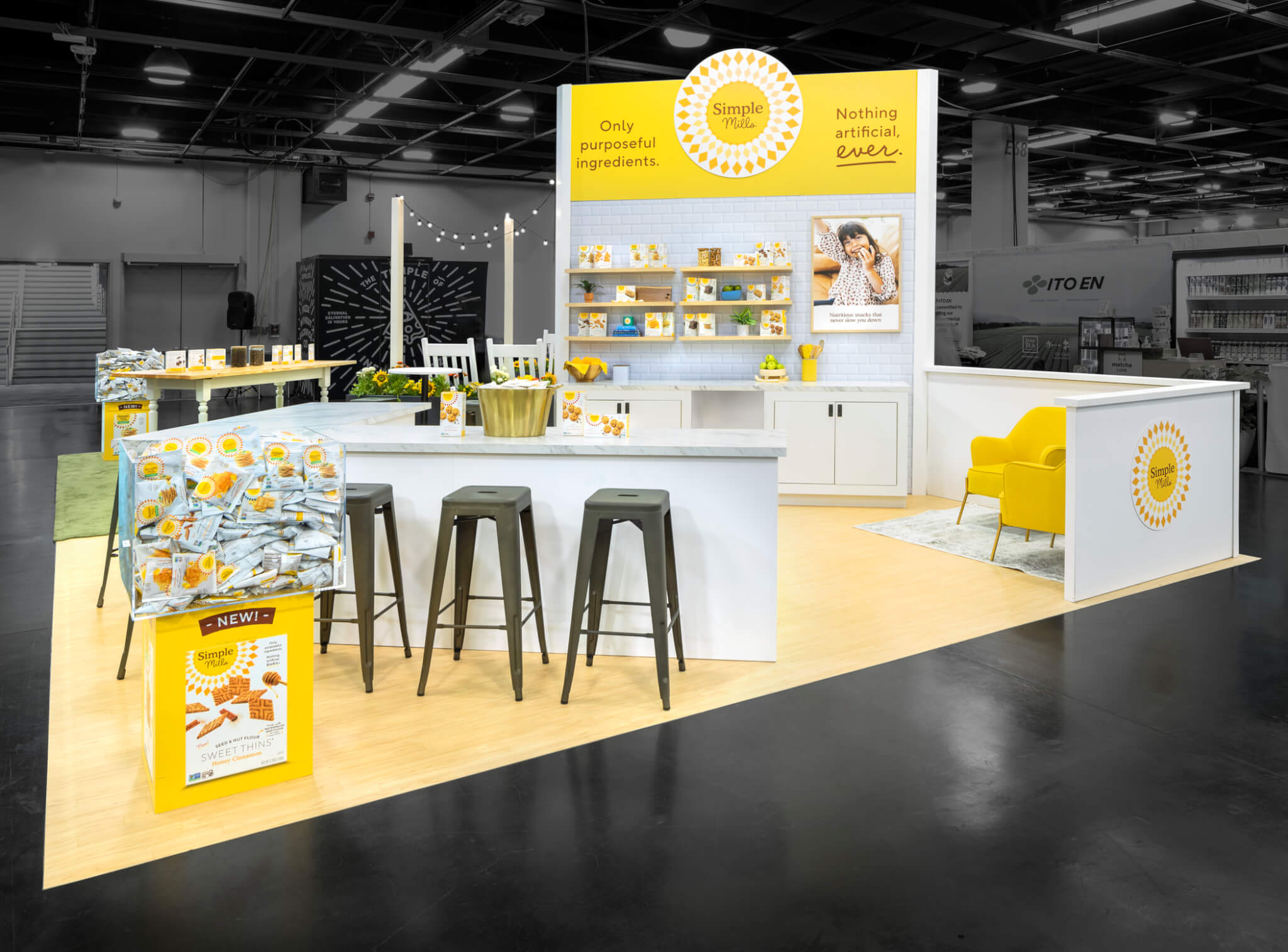 Keep it comfy! Let attendees imagine how they might enjoy your snacks, drinks, or other treats in a restaurant or at home. Seating areas encourage booth visitors to stop, rest, and truly experience your space, which allows for more observation and cultivation of interest in your brand and its messaging. This is also the spot where your sales team can engage and have meaningful conversations with buyers and prospects throughout the duration of the show.